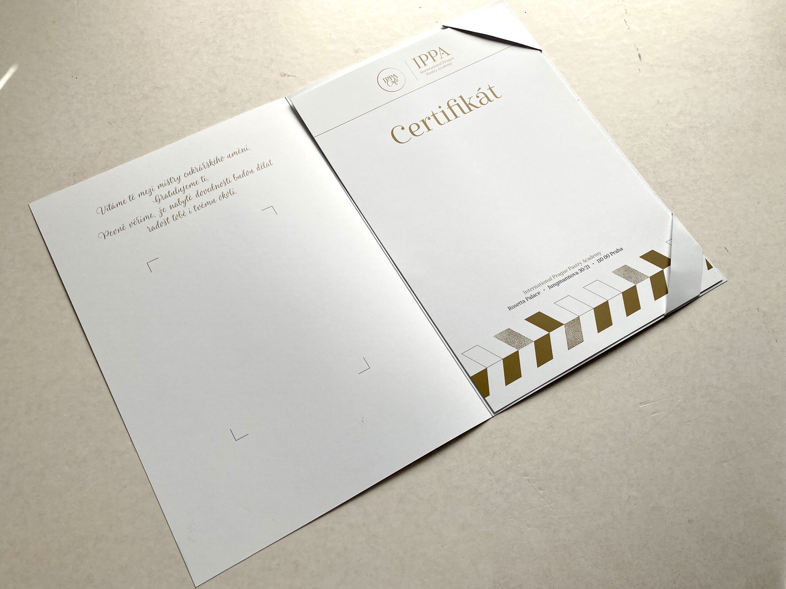 Jedná se o list certifikátu a jednoduché papírové desky s vlepenými růžky pro adjustaci certifikačního listu.